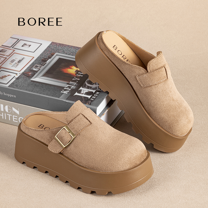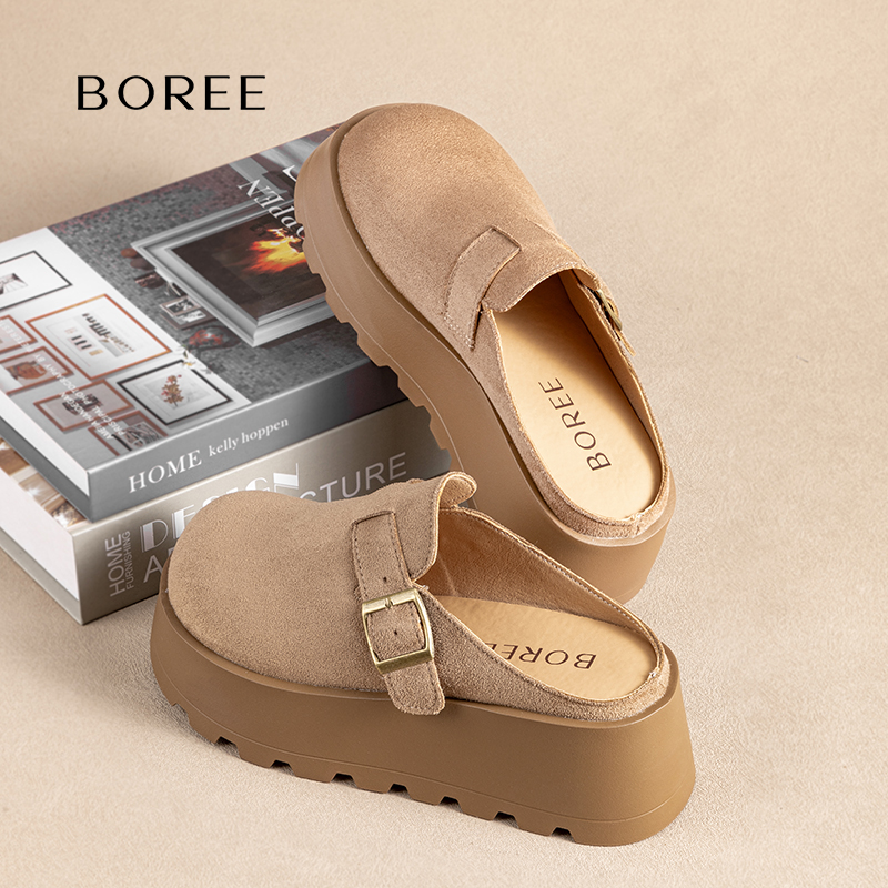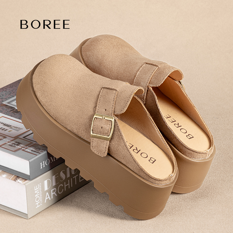 BOREE宝人厚底勃肯拖女款 懒人半拖真皮一脚蹬增高外穿 春秋包头鞋