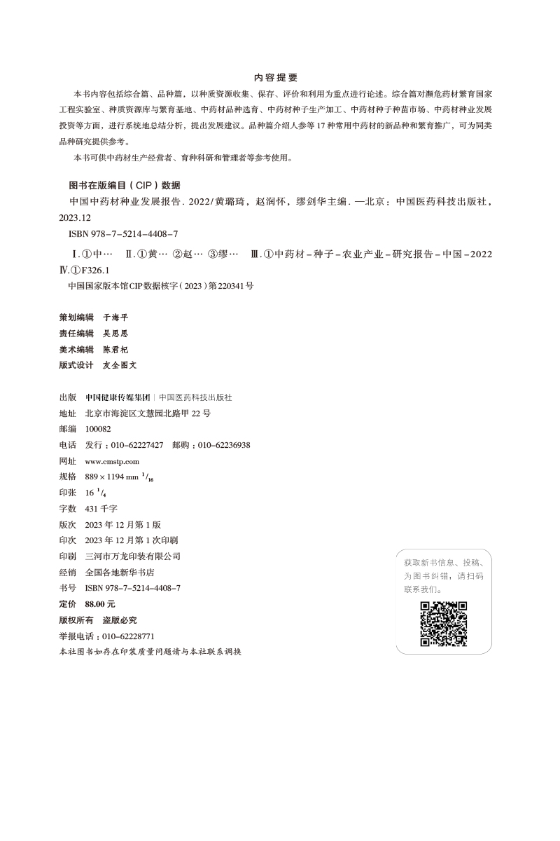 中国医药科技出版 中国中药材种业发展报告2022 育种科研和管理者 供中药材生产经营者 社9787521444087 中药材种子生产加工