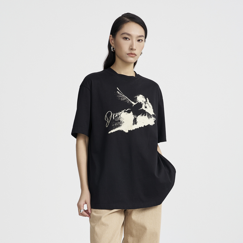 新款 春季 黑色阔版 微落肩圆领印花短袖 OTT 休闲T恤女装 商场同款