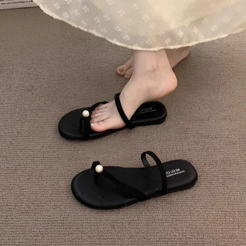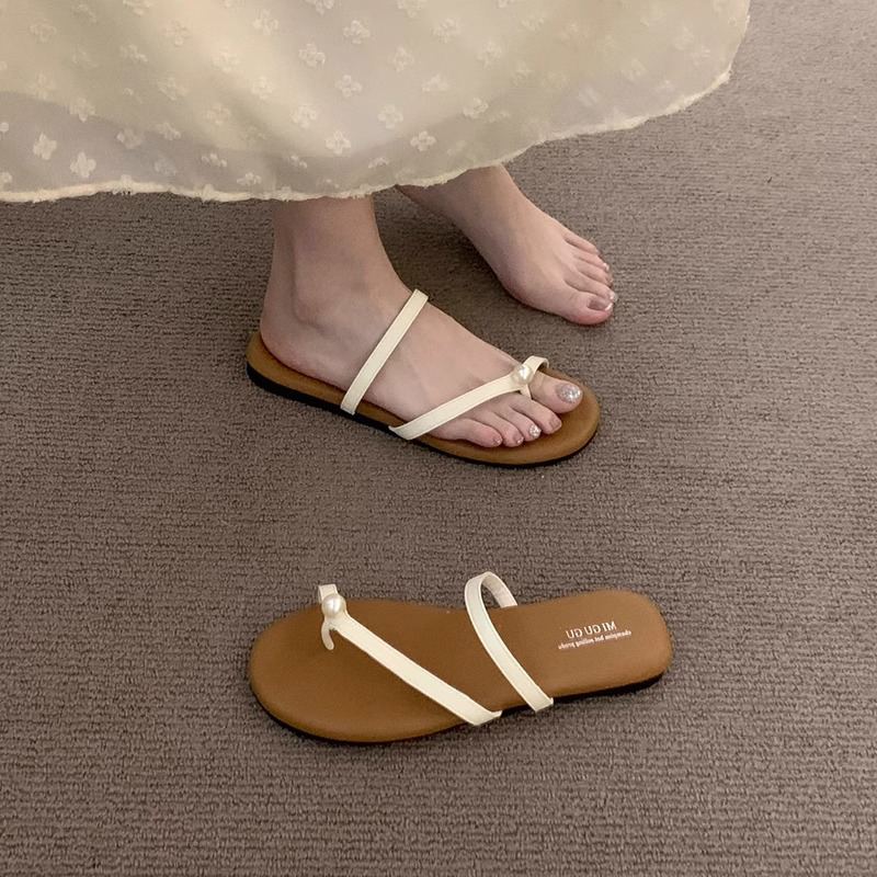 夹脚细带珍珠凉鞋 女夏外穿2025新款 凉拖鞋 平底配裙子简约套趾法式