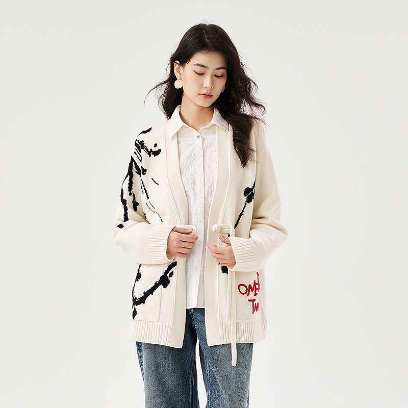 100%羊毛 提花毛织开衫 OTT2025春季 新中式 女白色羊毛衫 新款