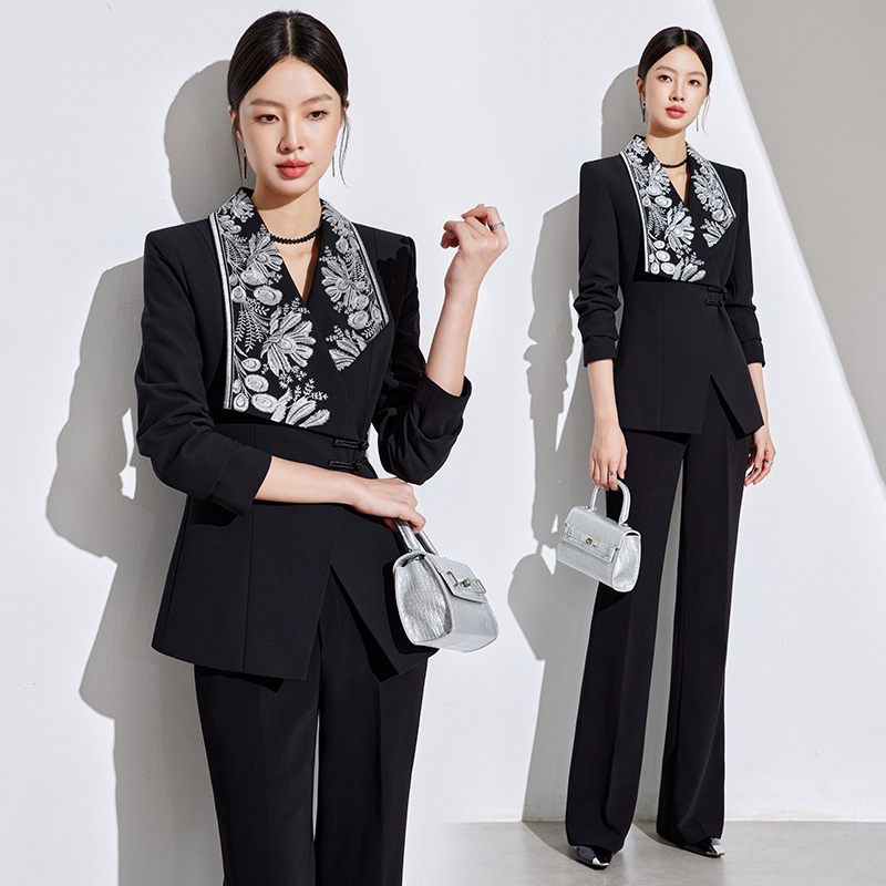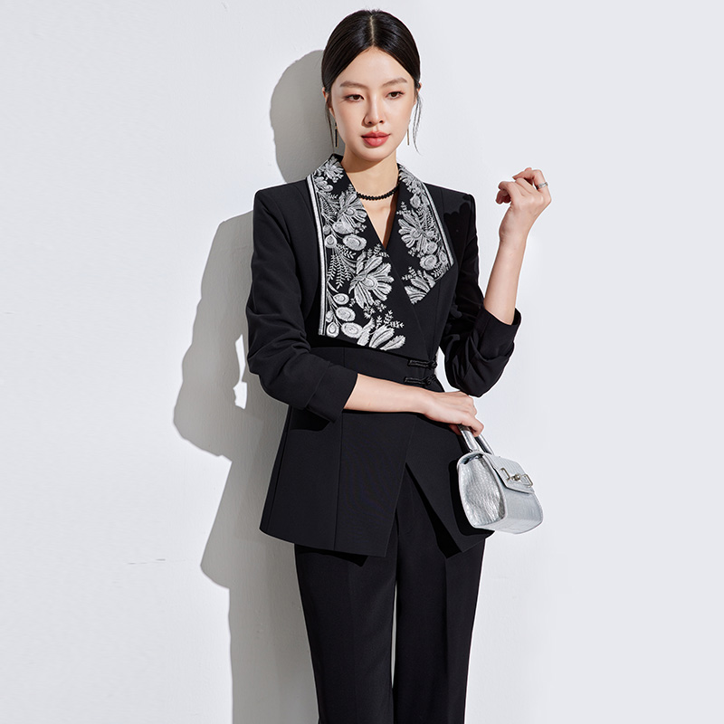 重工名媛外套 中式 国风原创黑色翻领刺绣西服套装 女气质女神范修身