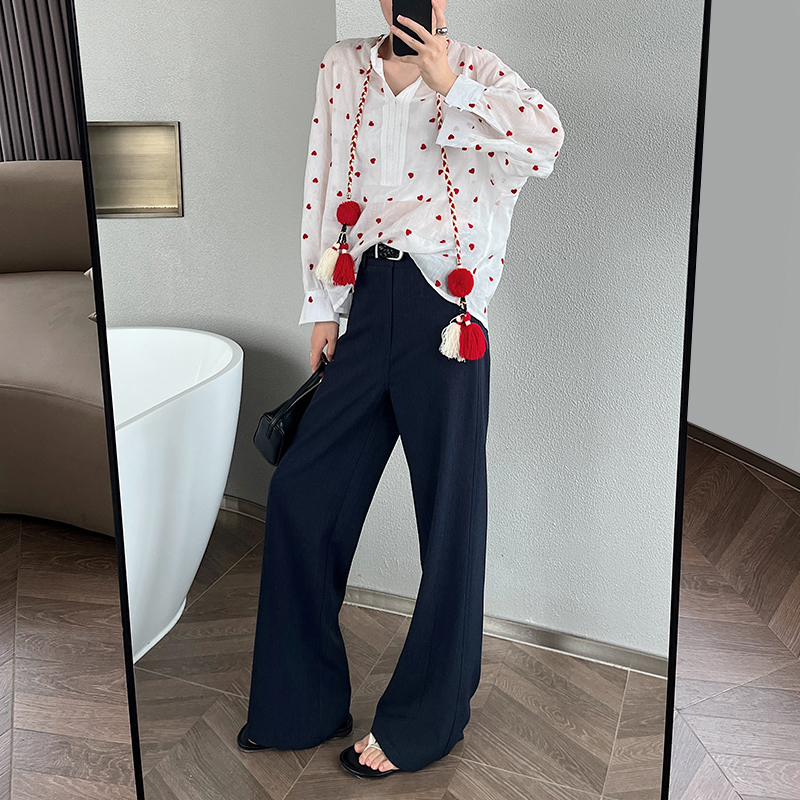 女春秋高腰垂感宽松棉羊毛拖地直筒裤 藏青色仿牛仔天丝西装 阔腿裤
