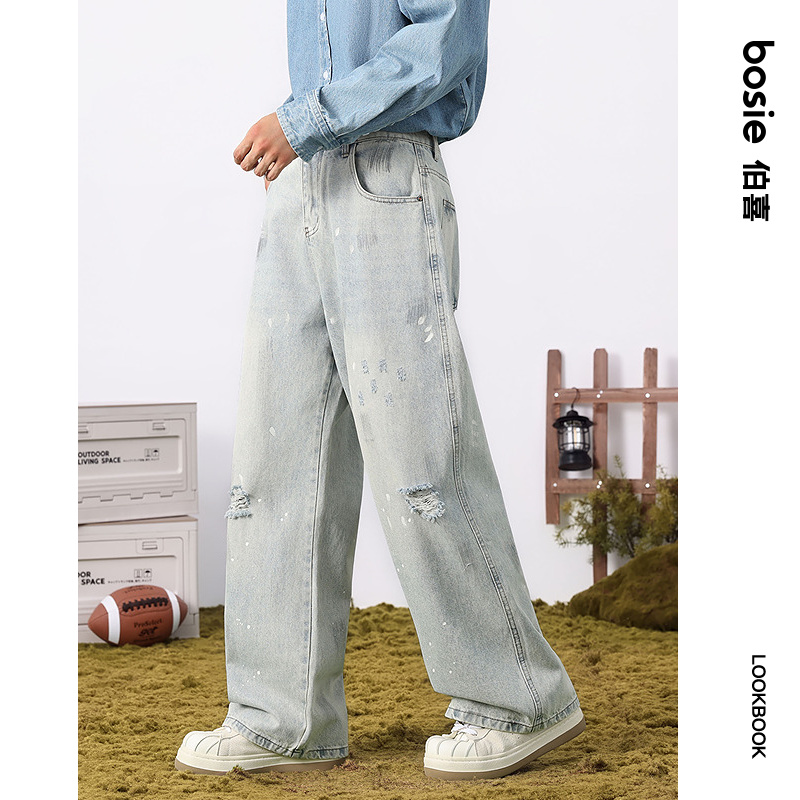 江南先生NewJNXS复古重磅斜纹撞色印绣花弯刀牛仔裤 子 宽松休闲裤