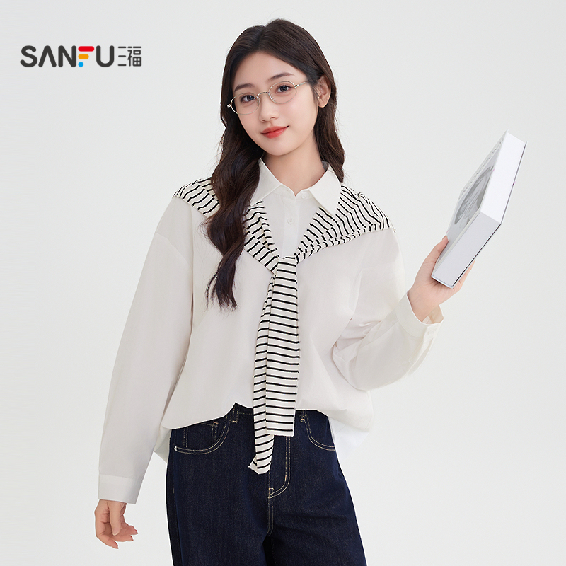 休闲韩系宽松可拆披肩上衣女装 三福长袖 秋季 女2025新款 504833 衬衫