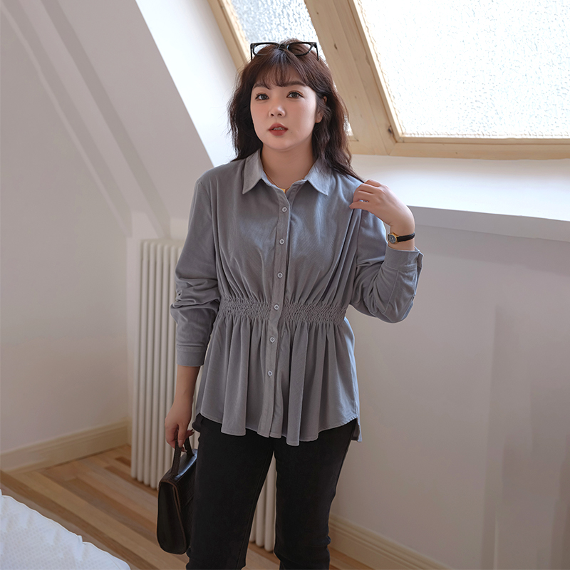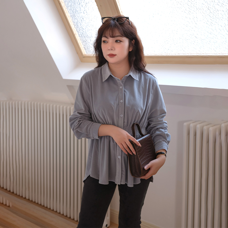 女装 气质长袖 翻领打揽收腰灯芯绒衬衫 时尚 上衣 胖mm秋装 蓝若水大码