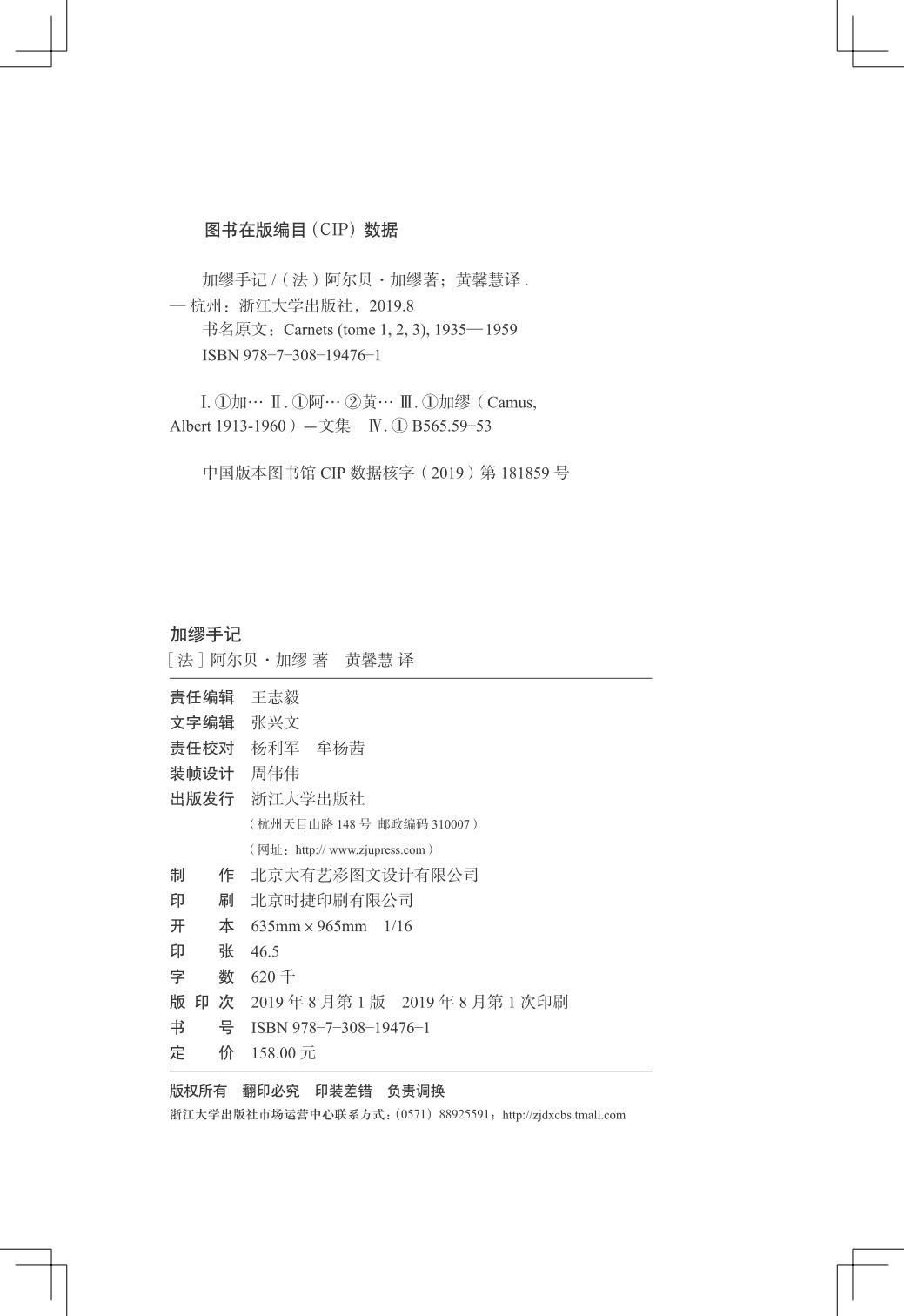 阿尔贝·加缪 本 黄馨慧 浙江大学出版 启真·加缪作品集 加缪手记 社 精装