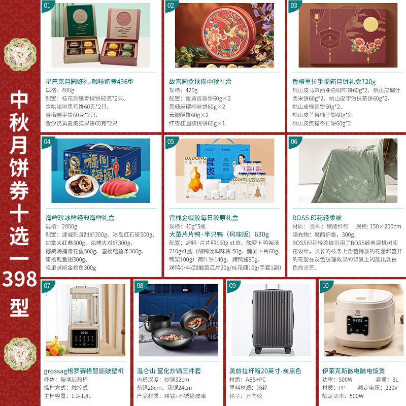 礼券月饼提货券10选1型398面值中秋节日多品牌礼品卡购物自选册券