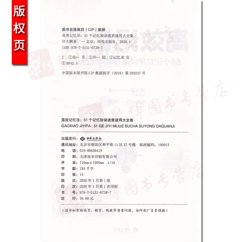 讲解简单实用 社 高效记忆法:51个记忆秘诀速查速用大全集 西苑出版 心理学 记忆妙法 方式 用科学有趣 许大鹏著 2020新书 现货