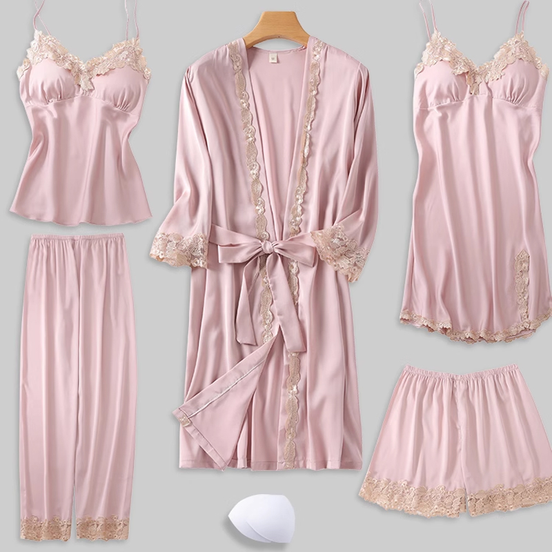 春秋睡衣女性感五件套丝绸吊带睡裙带胸垫冰丝薄款 睡袍家居服夏季