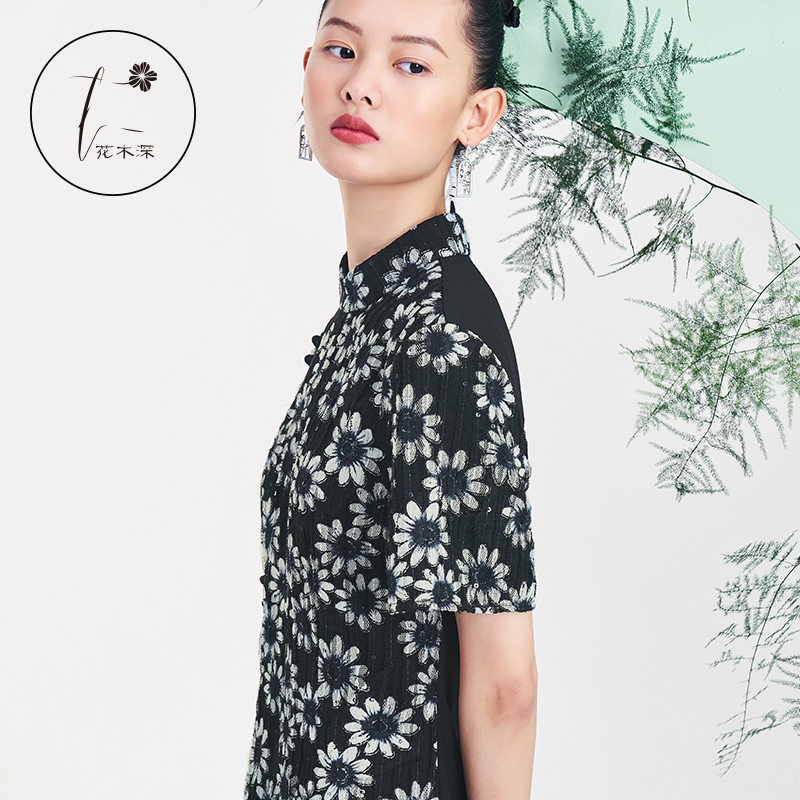 花木深复古改良版 盘扣中国风印花裙子女拼接蕾丝连衣裙 旗袍女新款