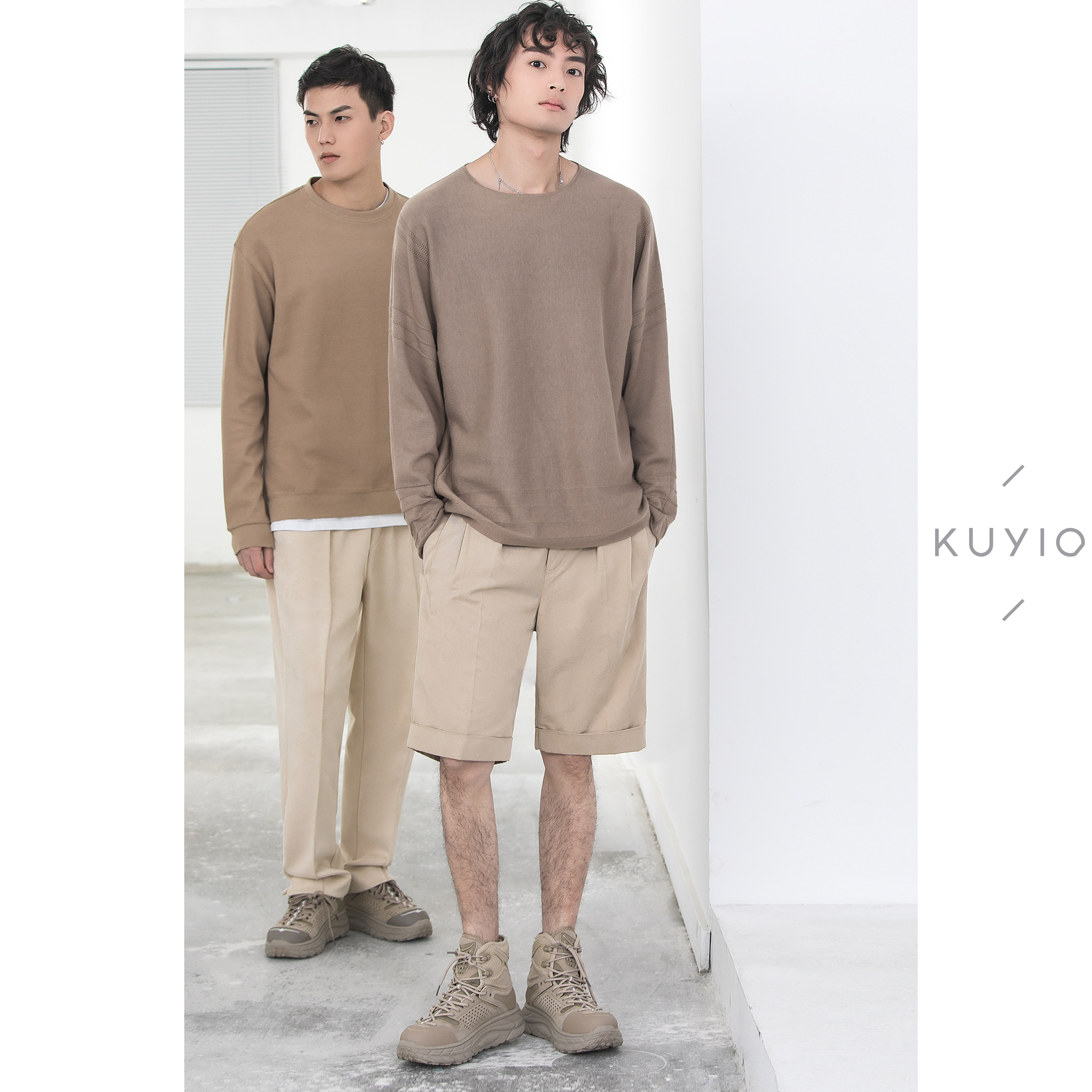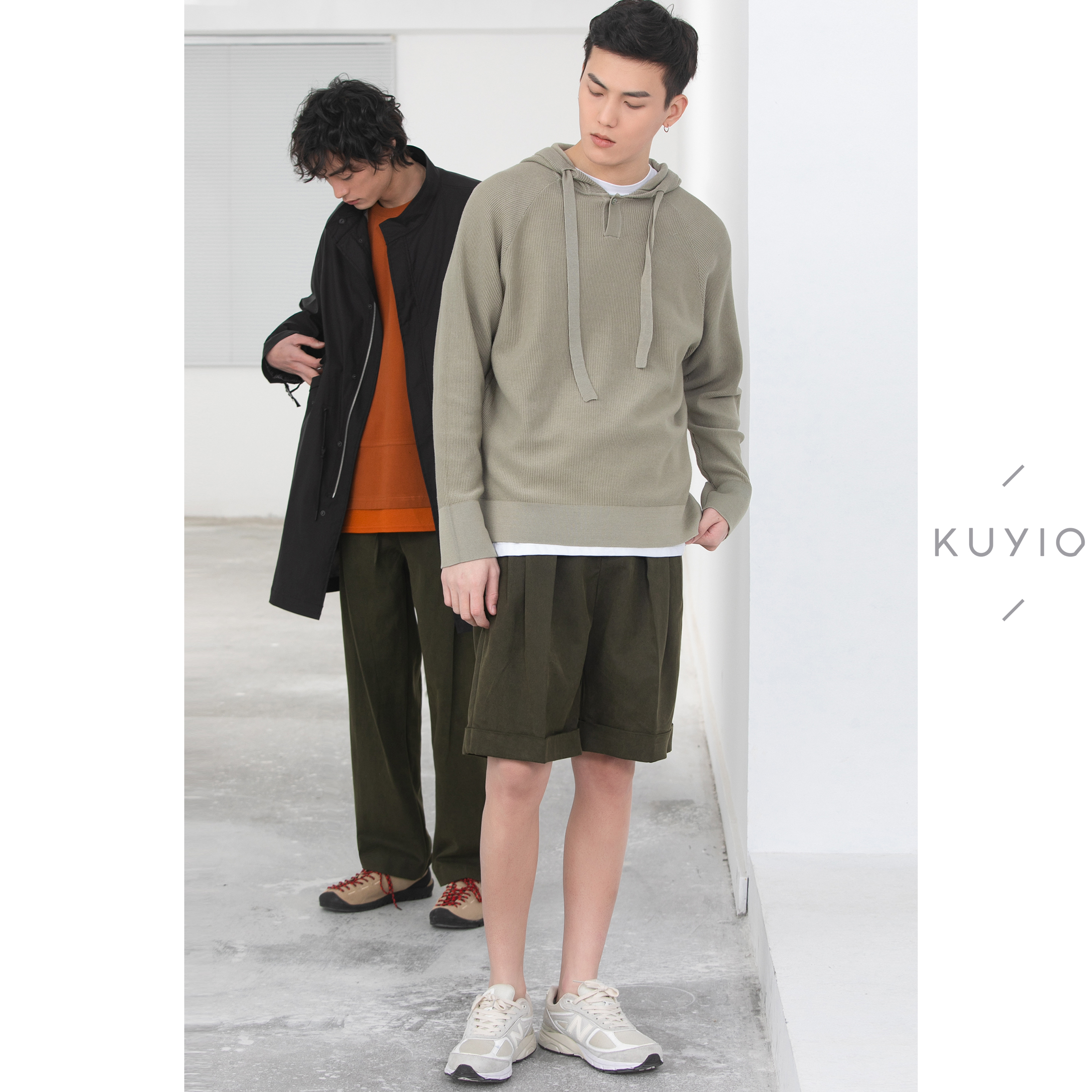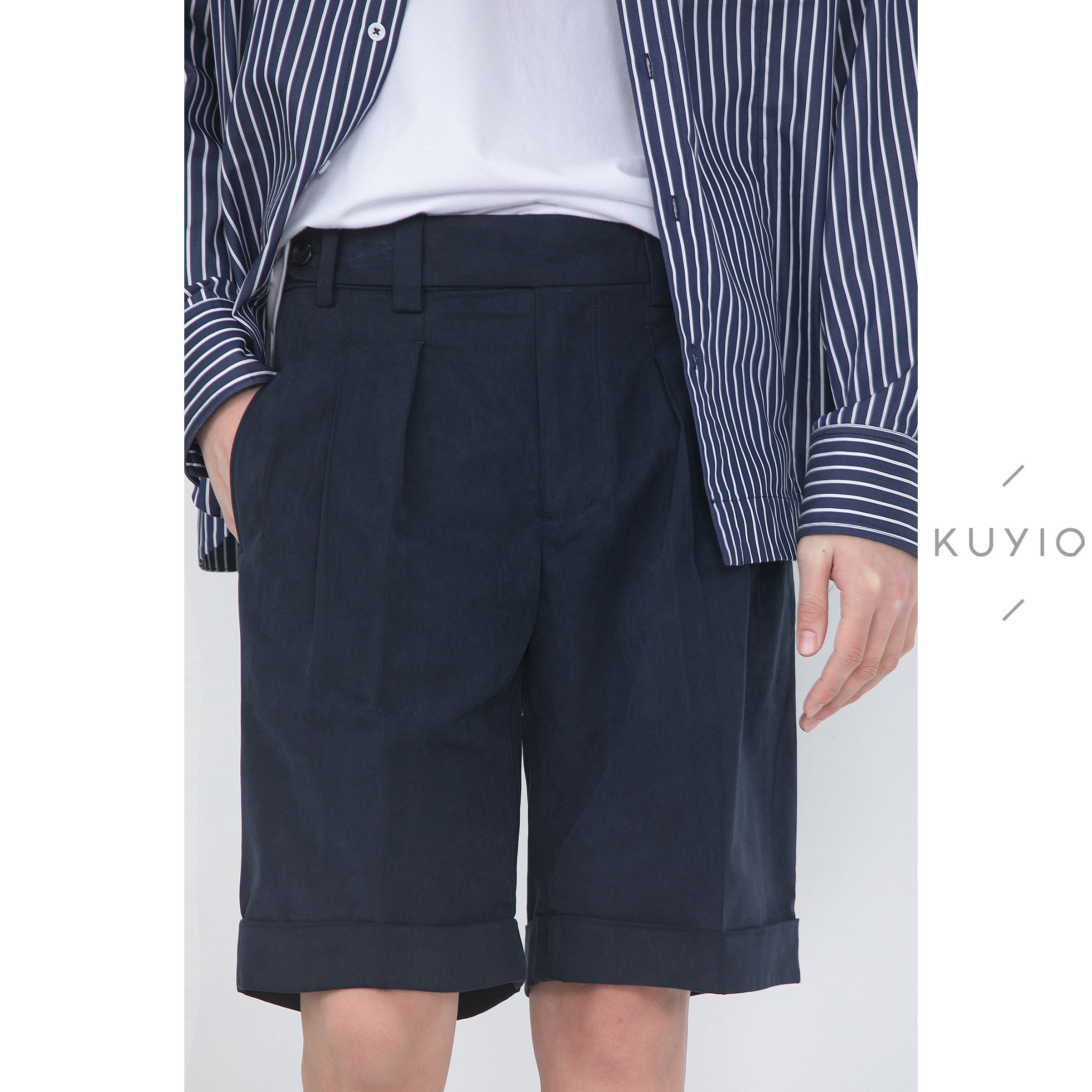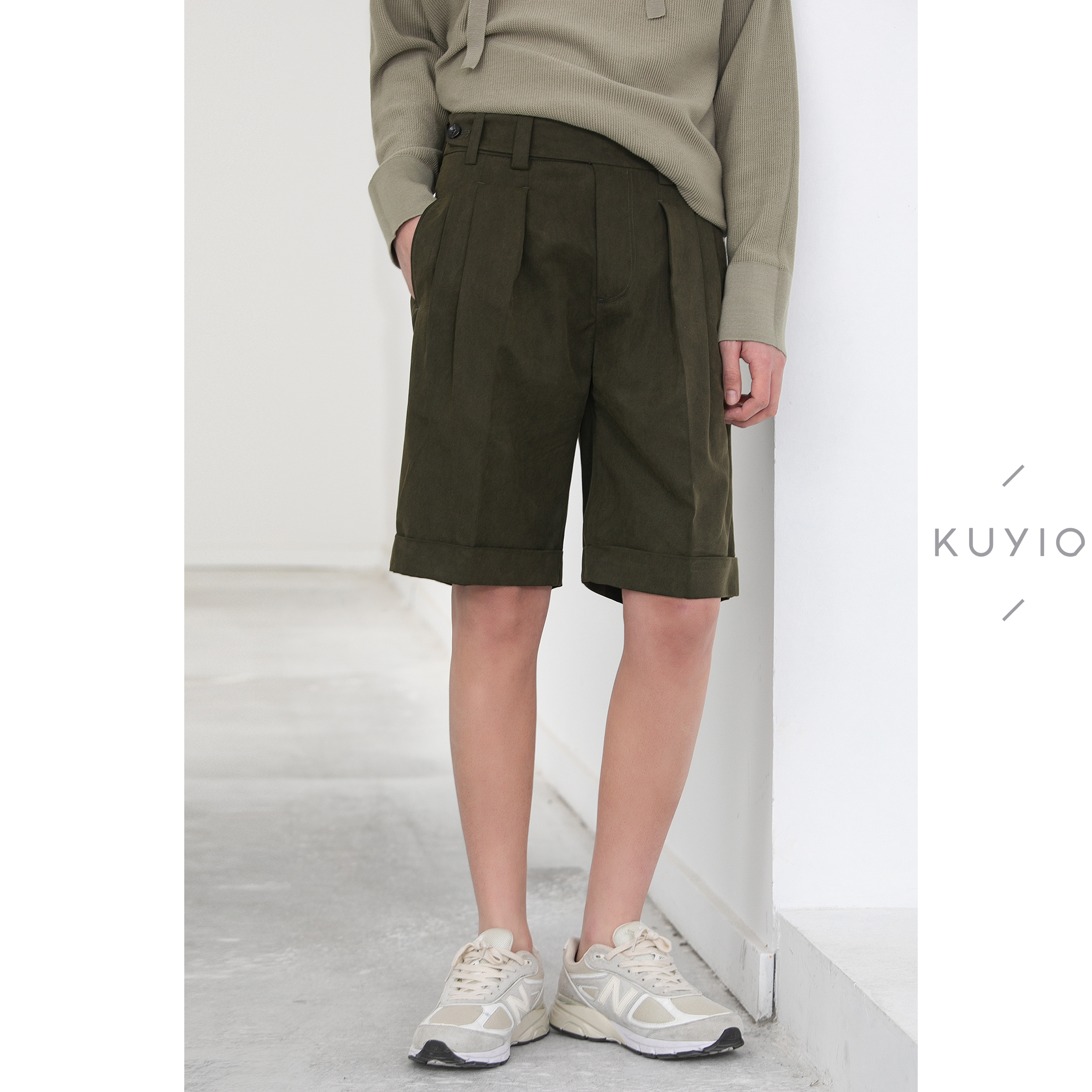 男 脚翻边宽松五分百慕大短裤 KUYIOU夏 圆柄腰袢莱赛尔棉双褶裤