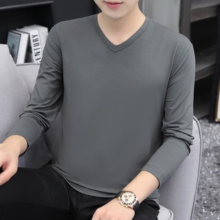 打底衫 春秋男装 内搭纯色秋衣V领薄款 T恤2025新款 上衣服 莫代尔长袖