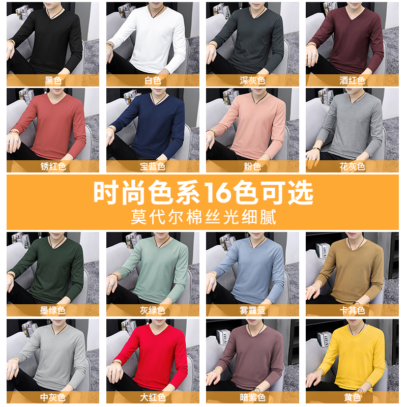 长袖 小衫 t恤潮流潮牌秋装 V领秋季 纯色秋衣服 内搭打底衫 莫代尔男士