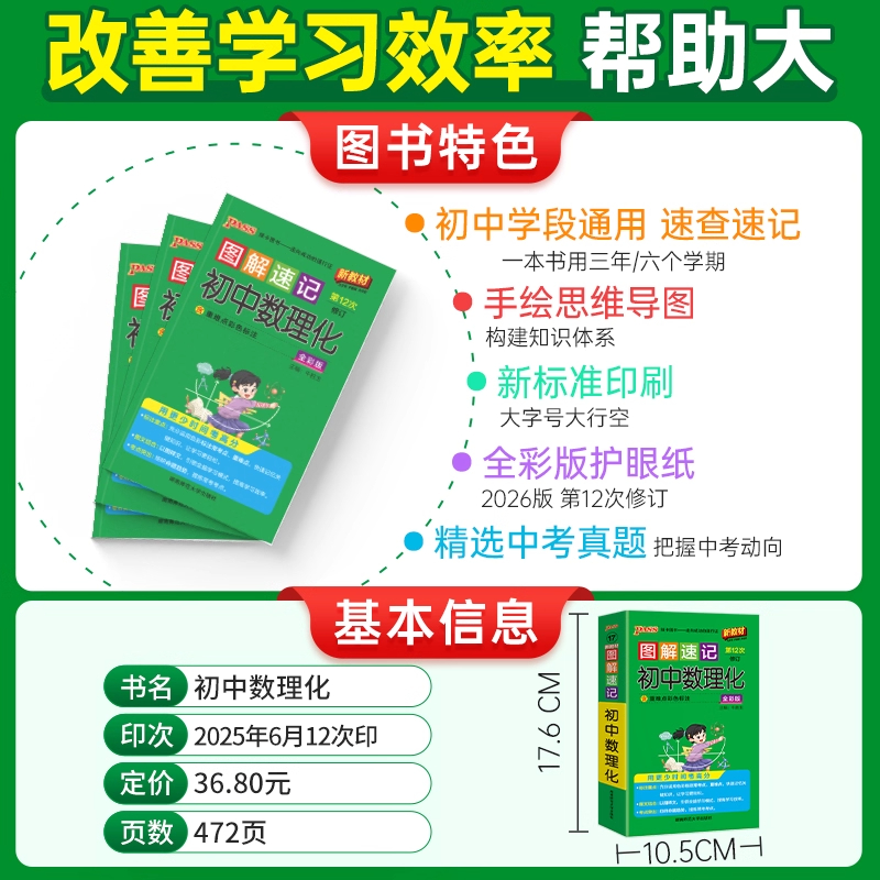 2026适用pass绿卡图解速记初中数理化全彩通用思维导图基础知识方法技巧公式 定律七八九年级中考数学物理化学知识大全解读典型例辅