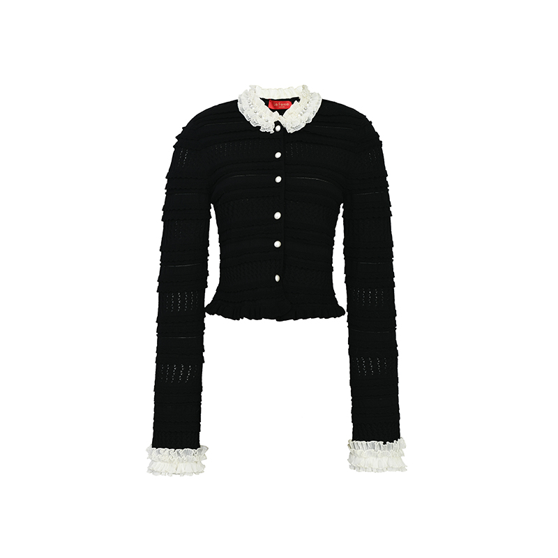 lefame拉飞姆秋季 上衣 浪漫层叠荷叶黑色针织开衫
