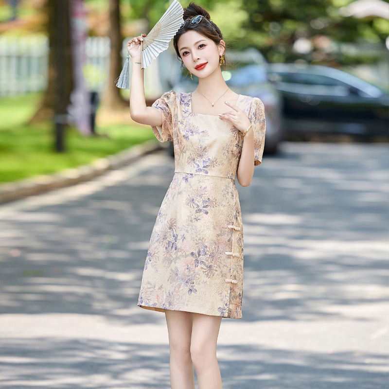 改良旗袍日常可穿年轻款 新款 方领裙子 国风连衣裙女小个子夏季 中式