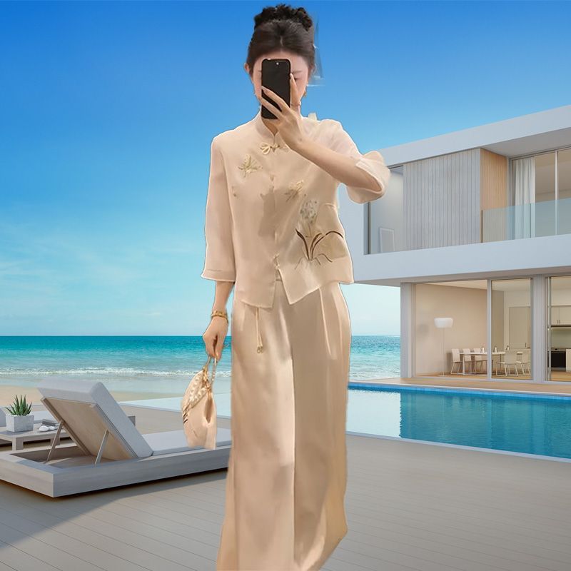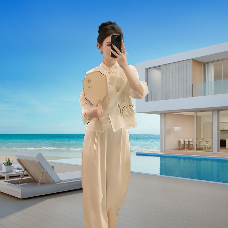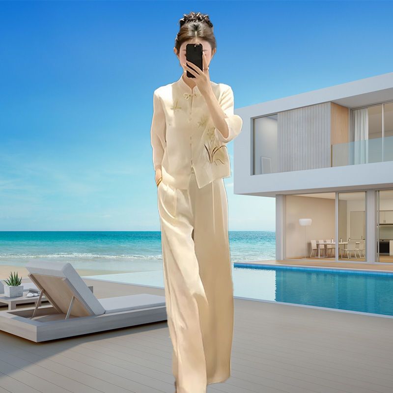 女2024新款 上衣休闲裤 夏季 衬衫 两件套 小个子高级感新中式 国风套装
