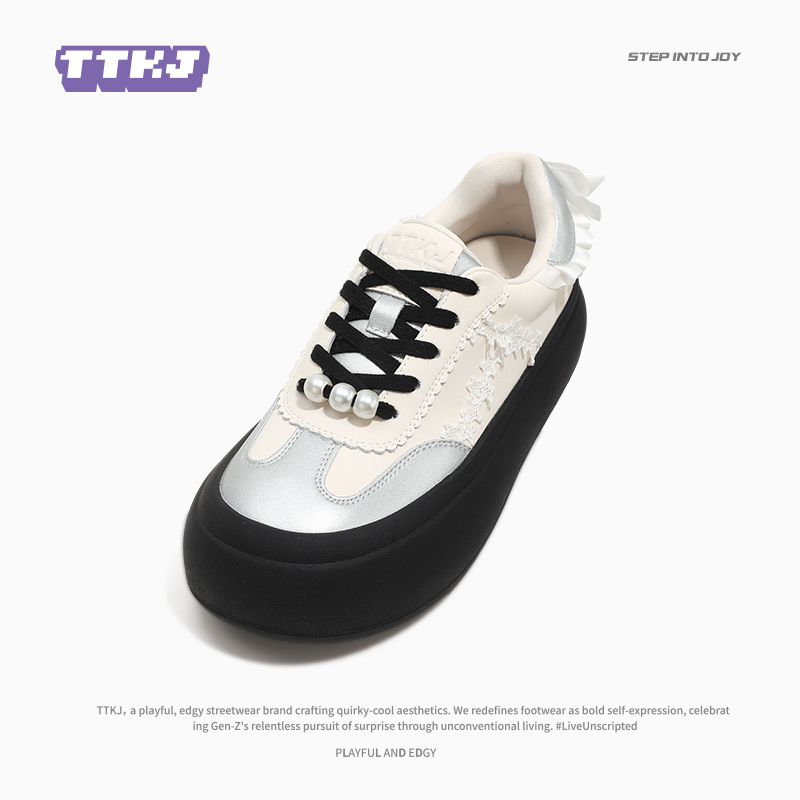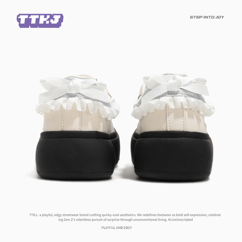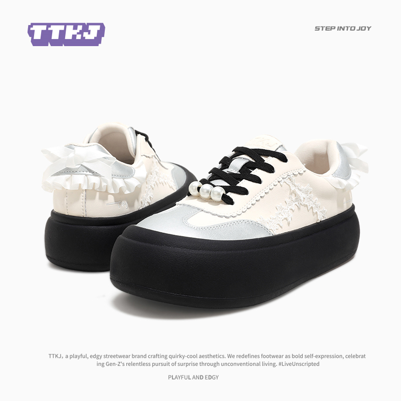 女板鞋 子百搭小白鞋 珍珠蝴蝶结大圆头丑萌厚底鞋 TTKJ芭蕾风德训鞋