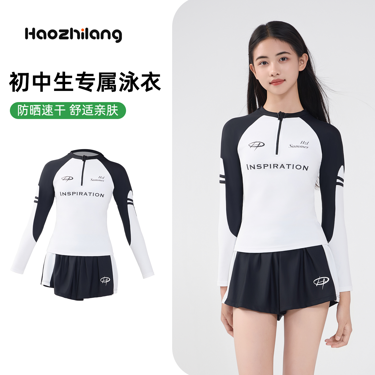 儿童泳衣女童分体长袖 防晒速干游泳衣女孩中大童初中生带胸垫大童
