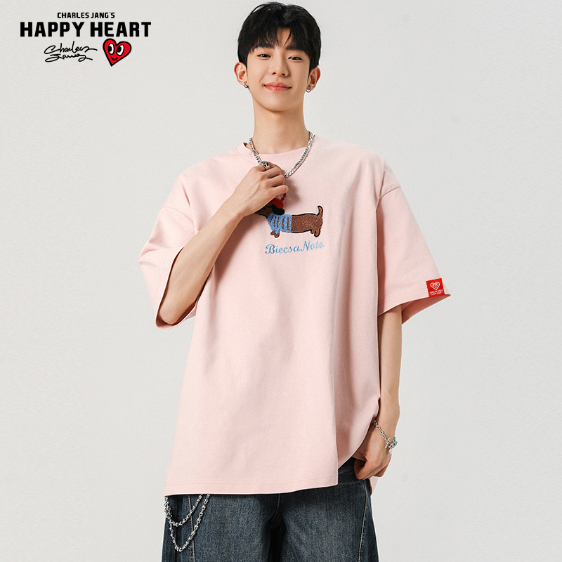 街头风情侣宽松半袖 t恤男美式 腊肠狗刺绣圆领休闲短袖 查尔斯桃心