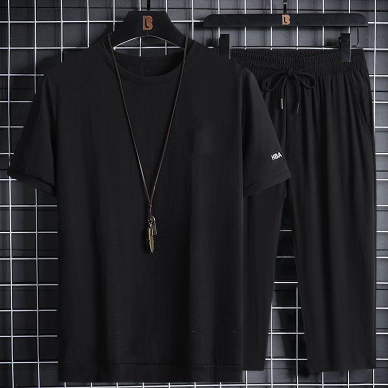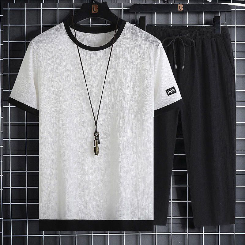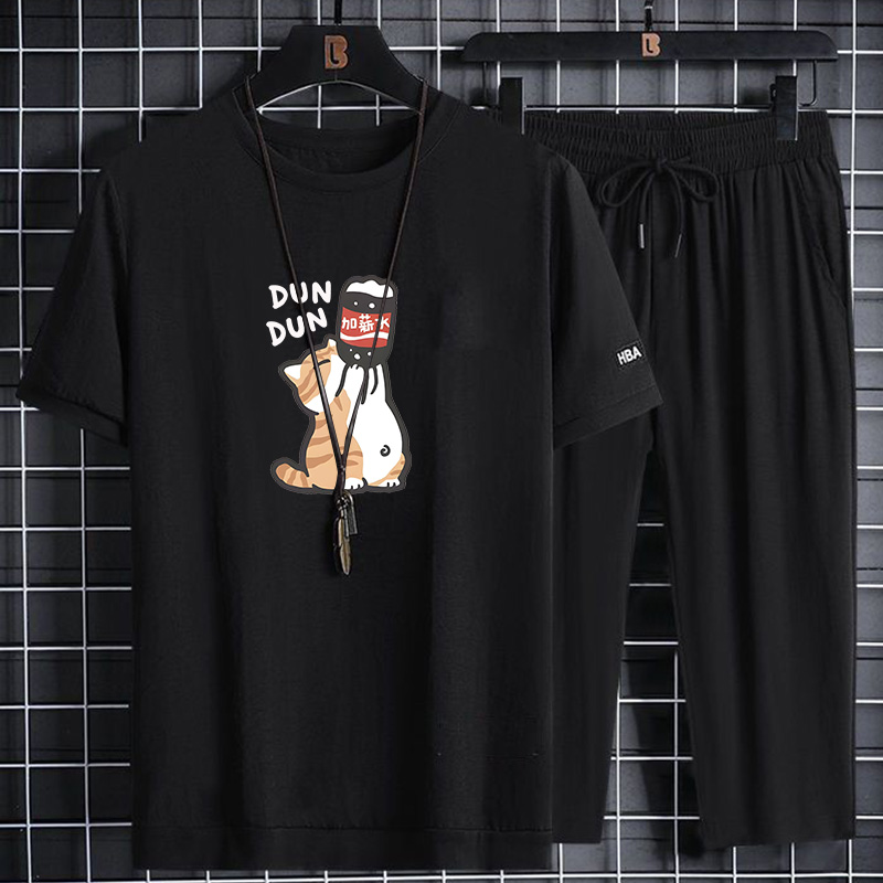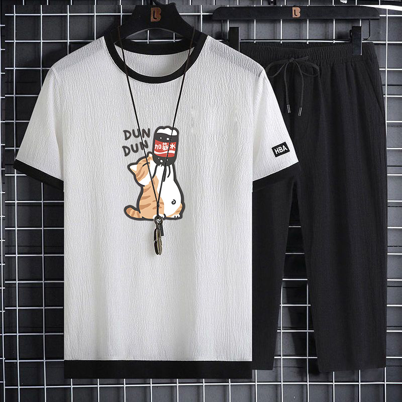 ins宽松长裤 男士 青少年潮牌帅气两件套 t恤套装 港风夏日休闲短袖
