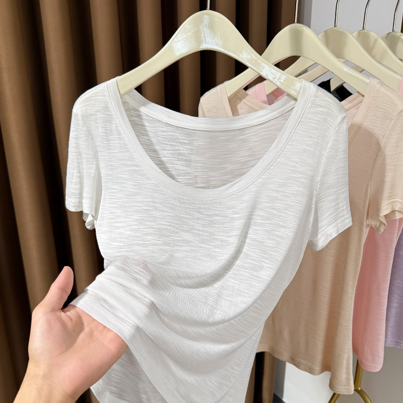 冰丝短袖 2025新款 内搭低领露锁骨上衣 T恤女夏季 竹节棉大圆领薄款