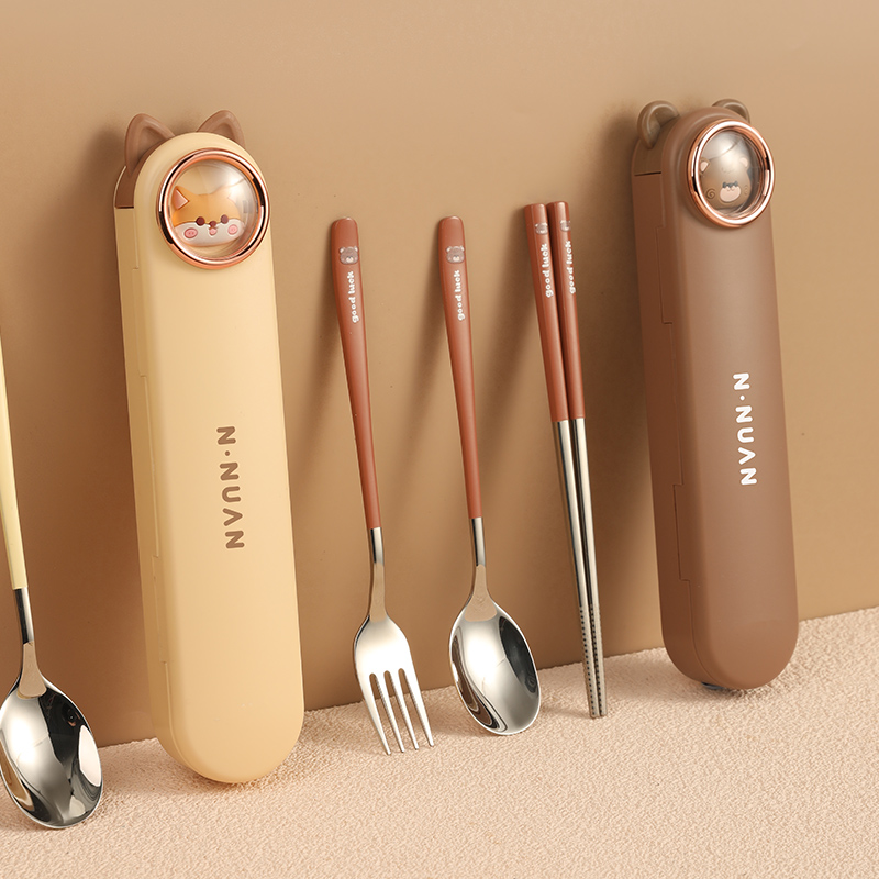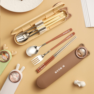 儿童筷子勺子叉子套装 小学生便携餐具304不锈钢卡通三件套收纳盒