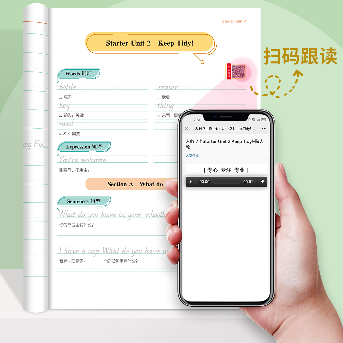 大开本描红字帖 跟读彩版 初中生英语同步练字帖七年级八年级九年级上下册人教版 意大利斜体描红字母单词句型扫码