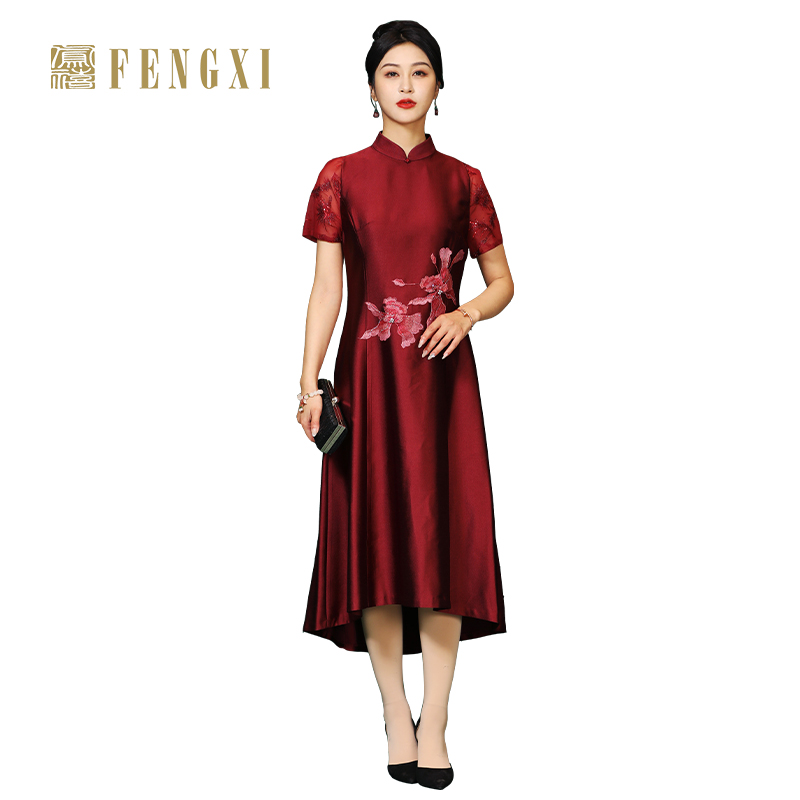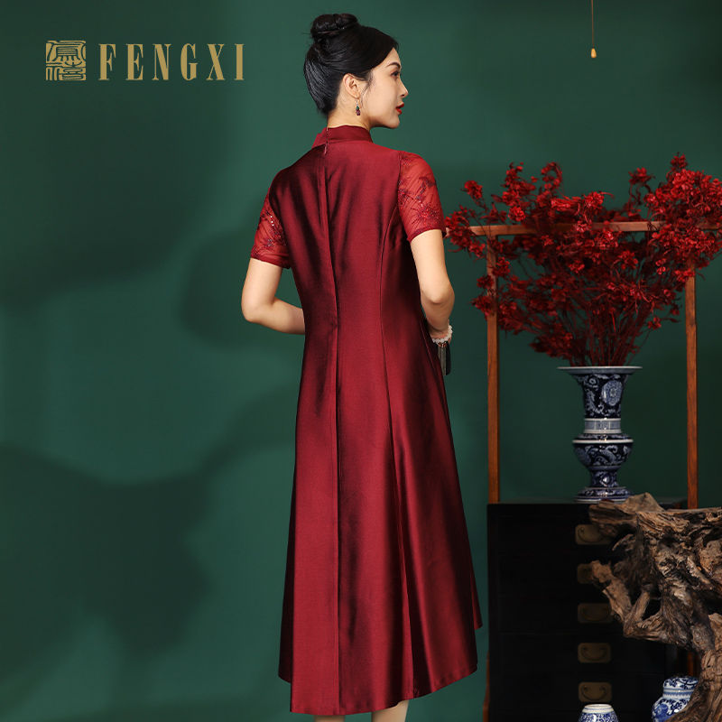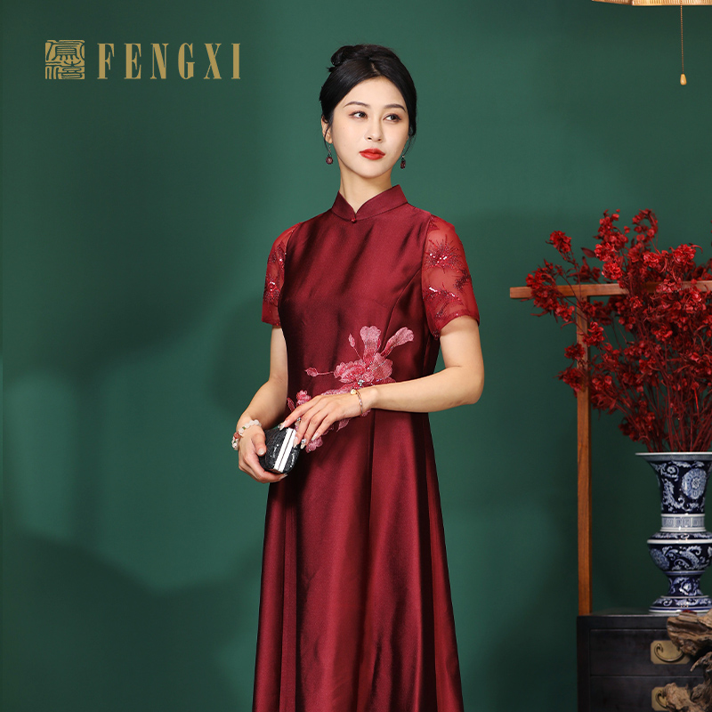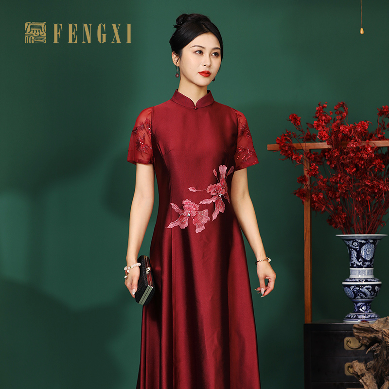 QS秸熙25夏季 轻国风收腰红色敬酒服晨袍连衣裙提花改良旗袍裙 新款