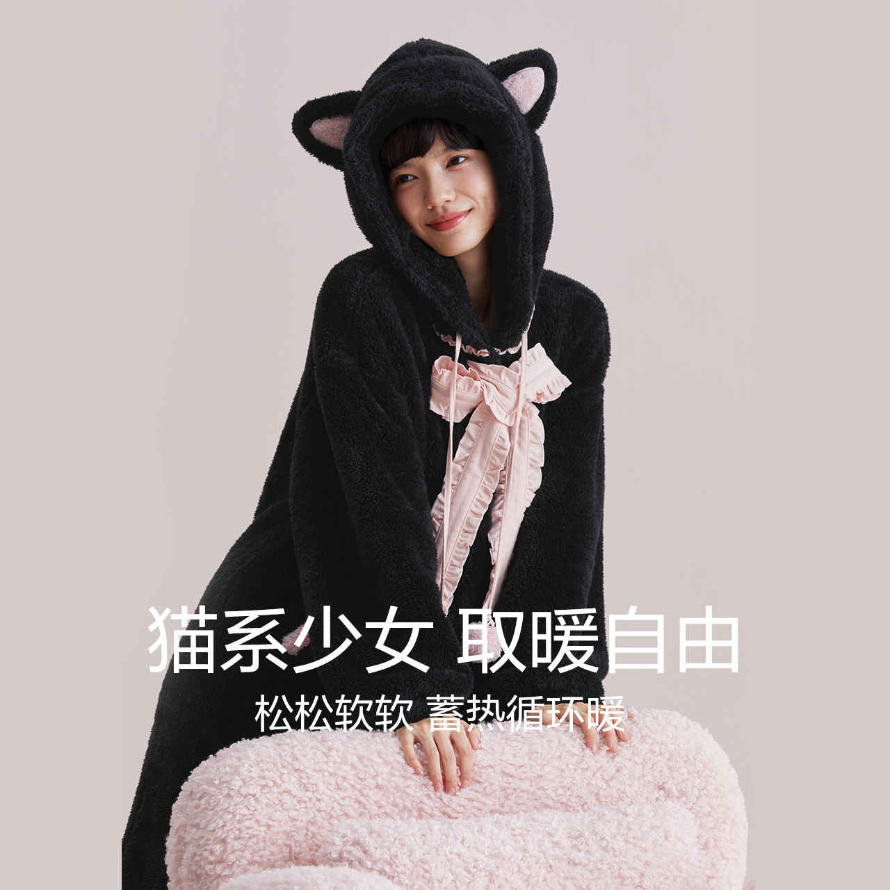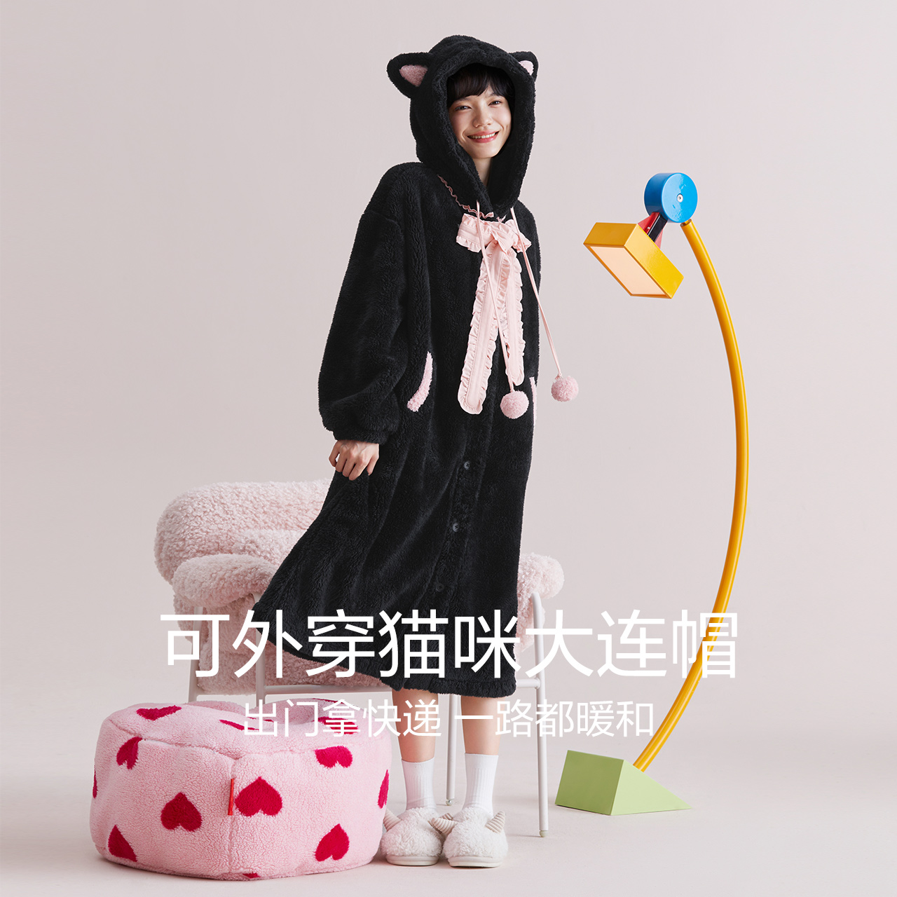 红豆女士舒适睡袍带帽珊瑚绒保暖猫系少女风可爱秋冬季 女 浴袍长款