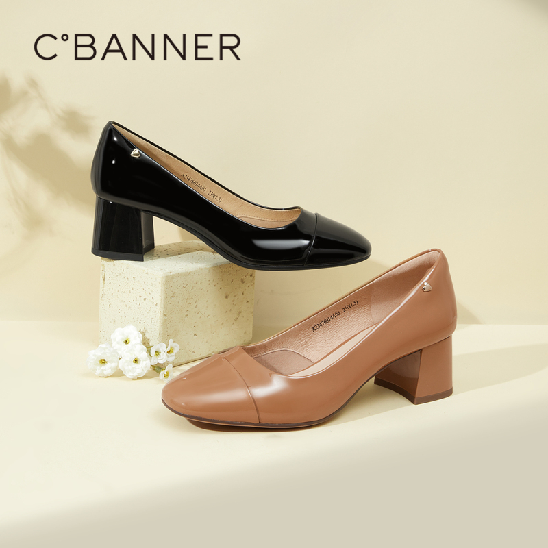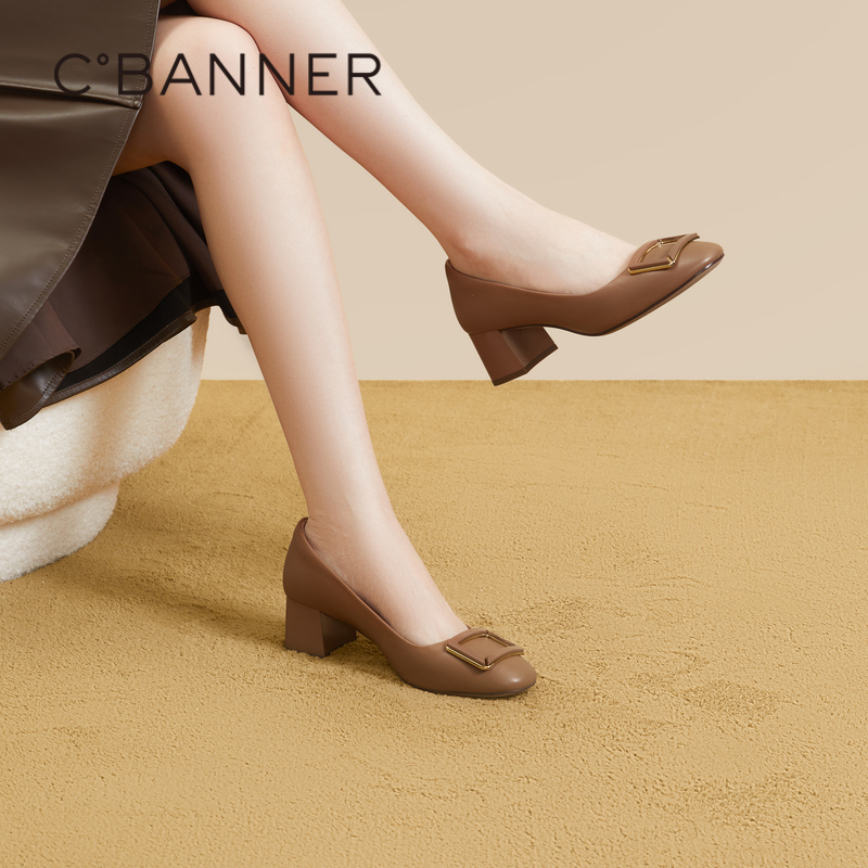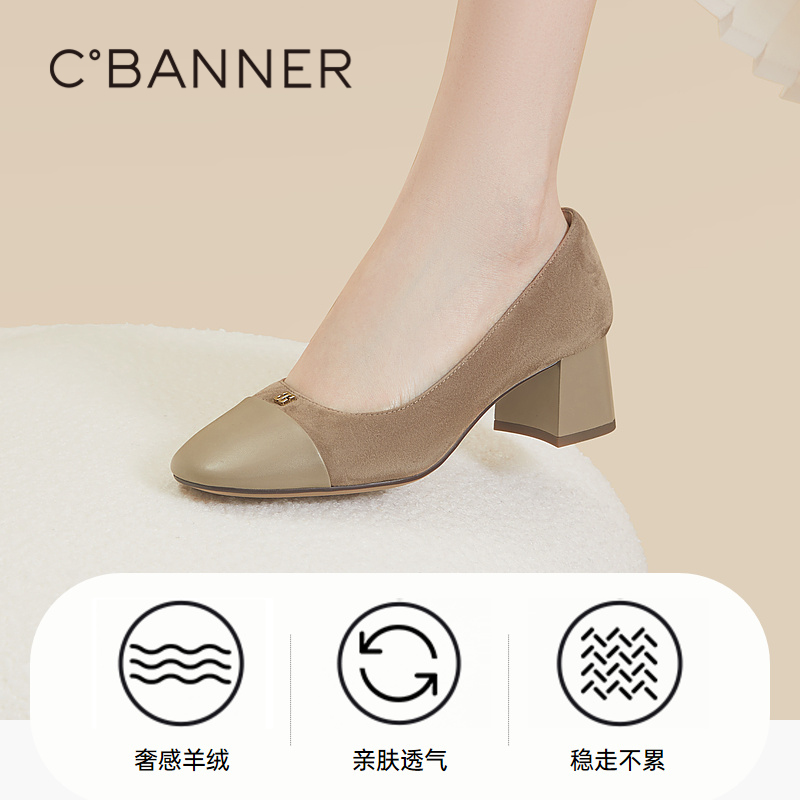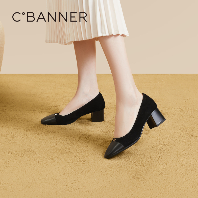 女粗跟通勤晚晚鞋 绒面拼色单鞋 真皮浅口 秋季 千百度高跟鞋