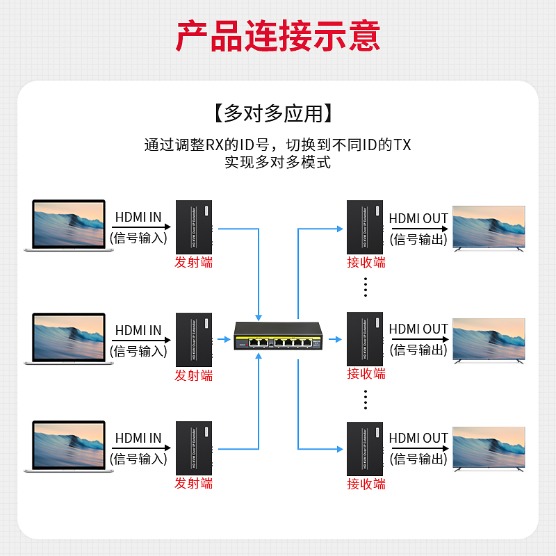HDMI网线延长器项目级KVM网络传输器矩阵99入253出一拖多对多200米USB键鼠红外信号音视 poe供电 HDMI转网线