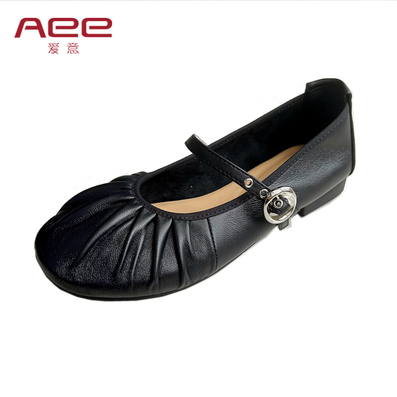 女 软底圆头玛丽珍自然卷褶皱平底舒适羊皮单鞋 Aee 爱意2024新款