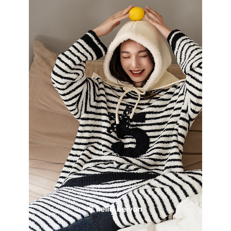 贝妍珊瑚绒睡衣女秋冬新款 圆领套头条纹家居服保暖半边绒宽松套装