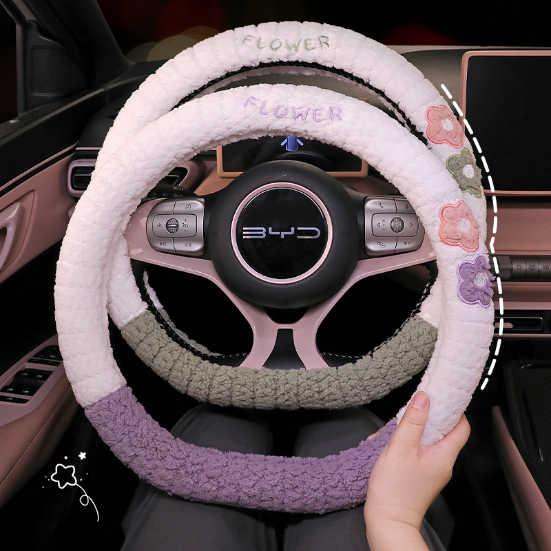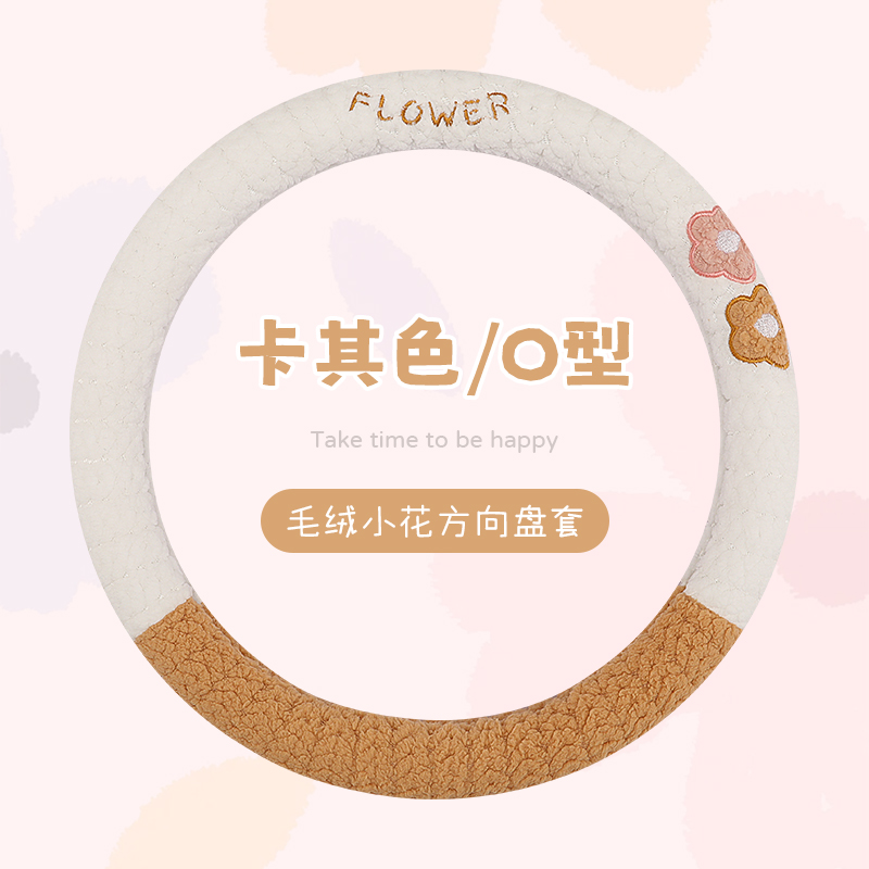 汽车方向盘套冬季 防滑保暖小花朵短绒简约车保护把套 毛绒可爱女款