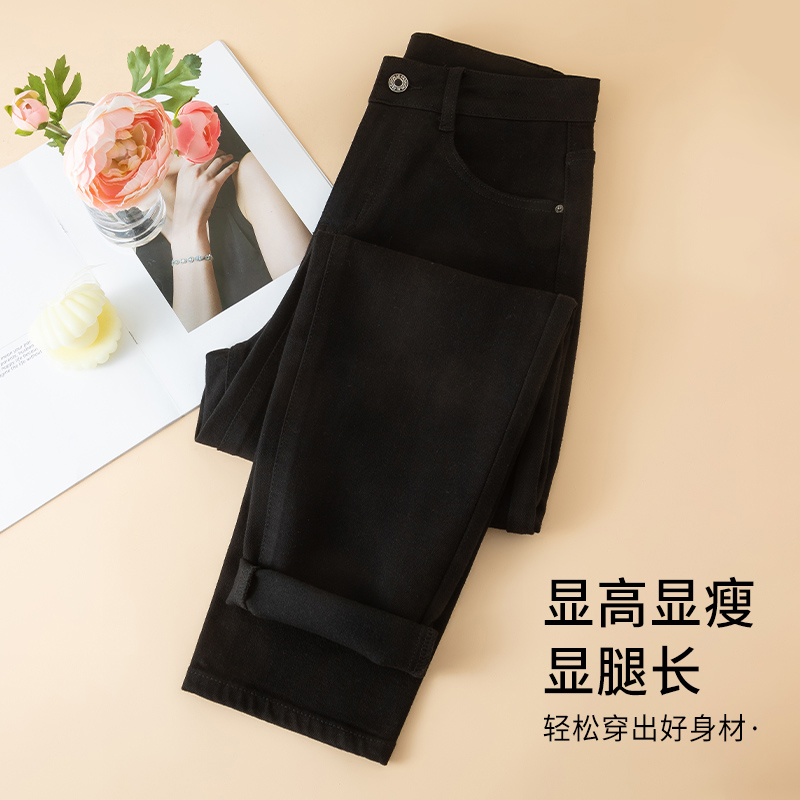 子 女2025加绒显瘦穿搭直筒阔腿长裤 自然涩秋冬季 侧拉链黑色牛仔裤