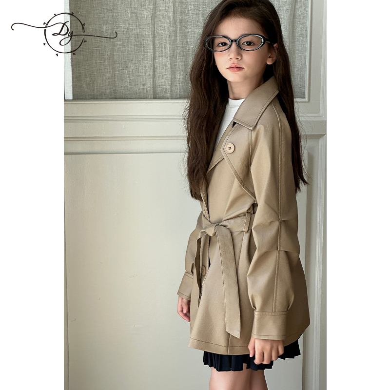 外套 中大童英伦风设计感儿童中长款 小叮尤尤女童皮衣2025秋季 新款