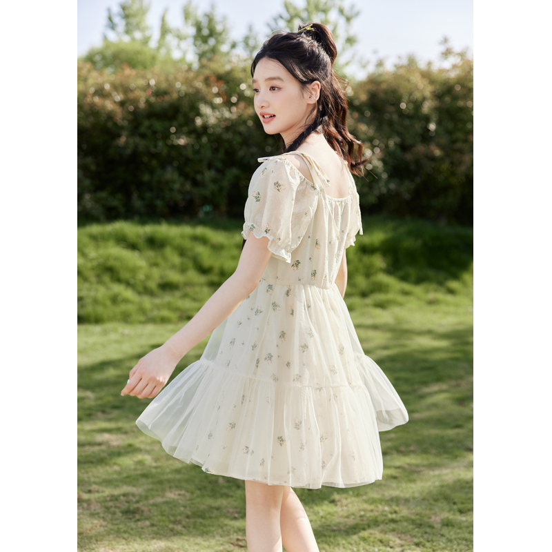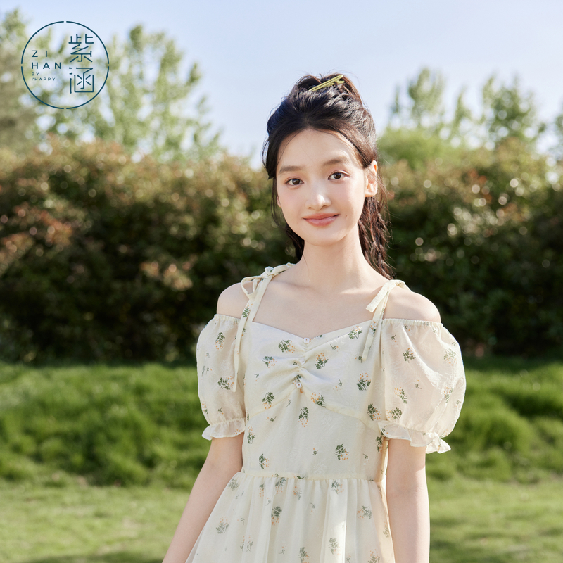 紫涵吊带一字肩连衣裙女2025年夏季 提花拼接蕾丝裙高腰公主裙 新款