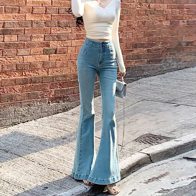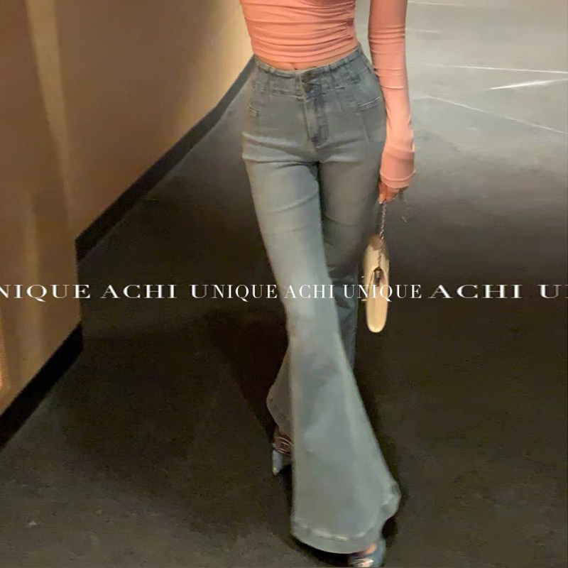 高腰显瘦不贴腿垂感阔腿喇叭裤 新款 子 女秋冬季 加绒复古微喇牛仔裤