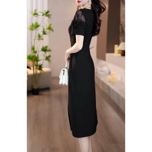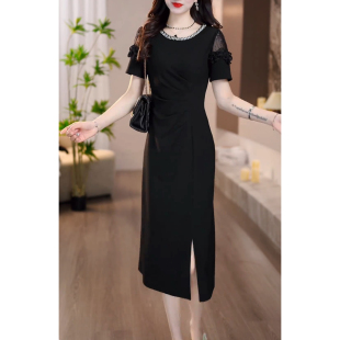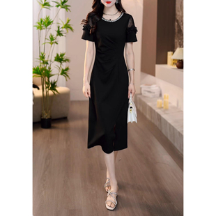 时尚 气质褶皱短袖 中长款 新款 开叉裙子 显瘦连衣裙女2025年夏季 大码