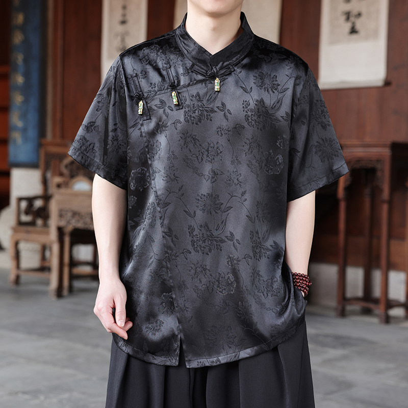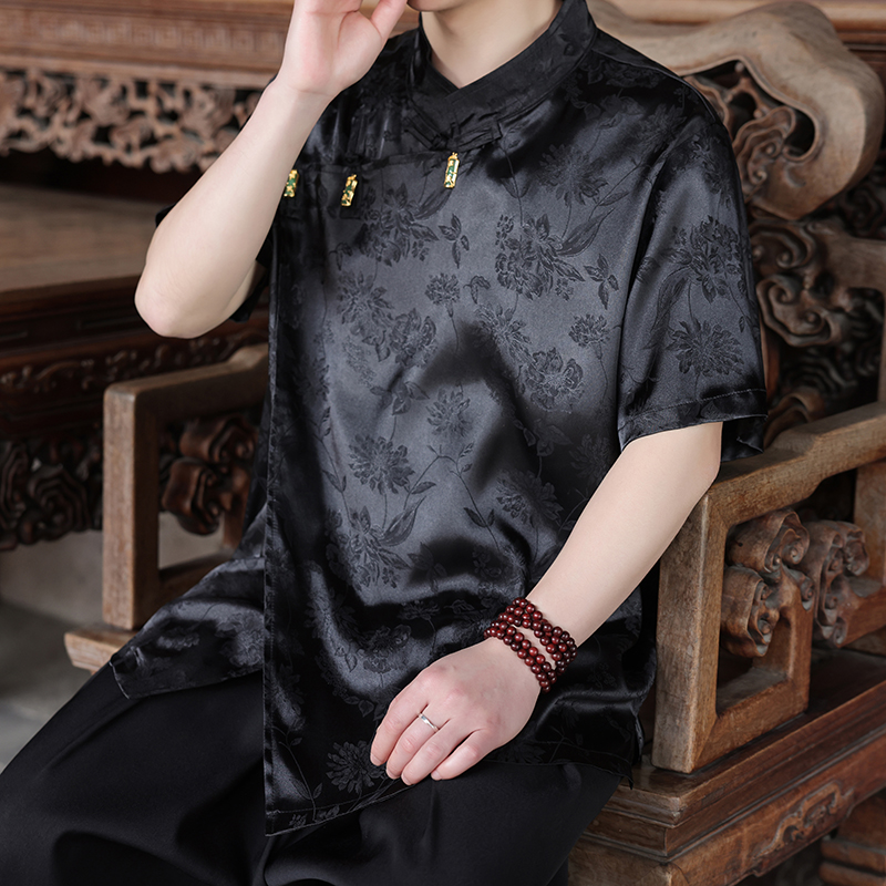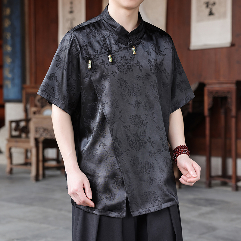 套装 不规则斜襟冰丝短袖 国风提花汉服衬衣不规则裙裤 男新中式 衬衫