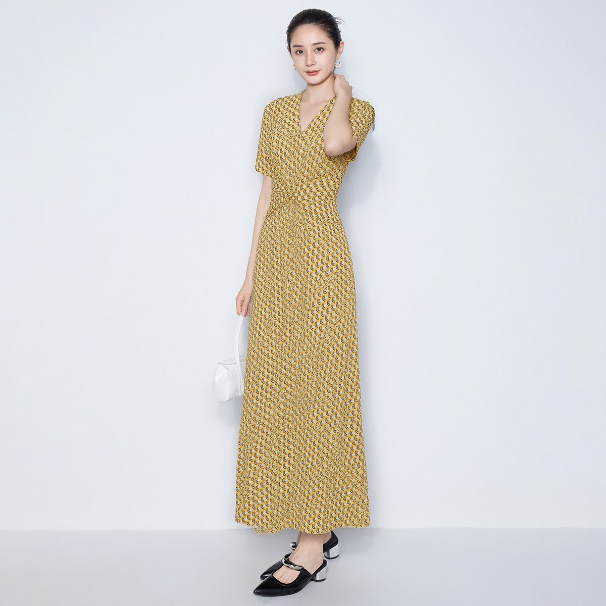 气质时尚 黄色印花连衣裙V领收腰短袖 马天奴新款 度假女 TENO