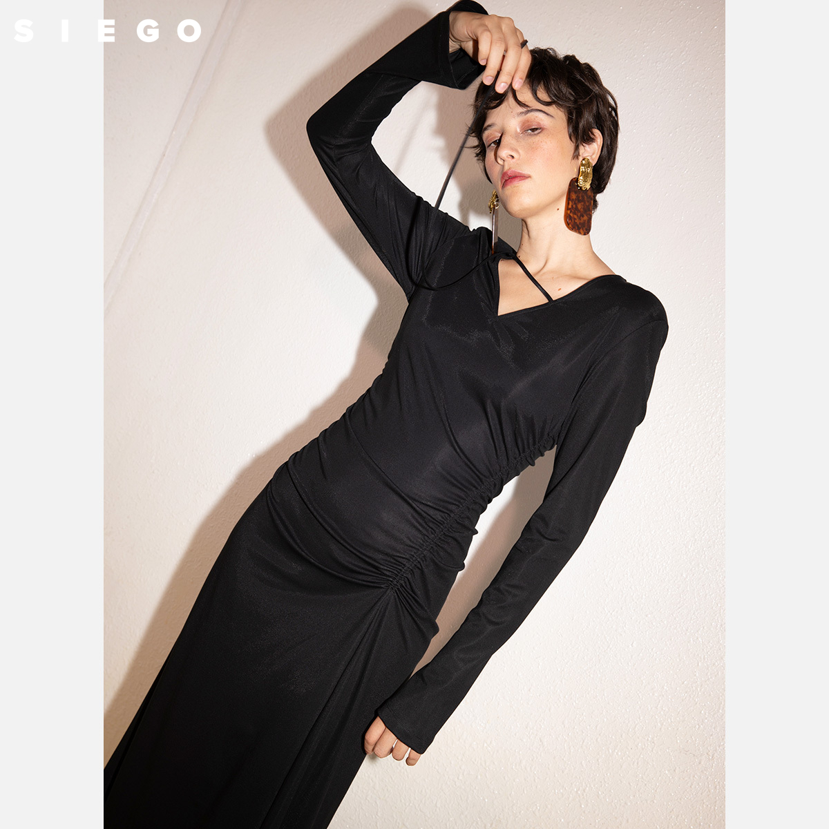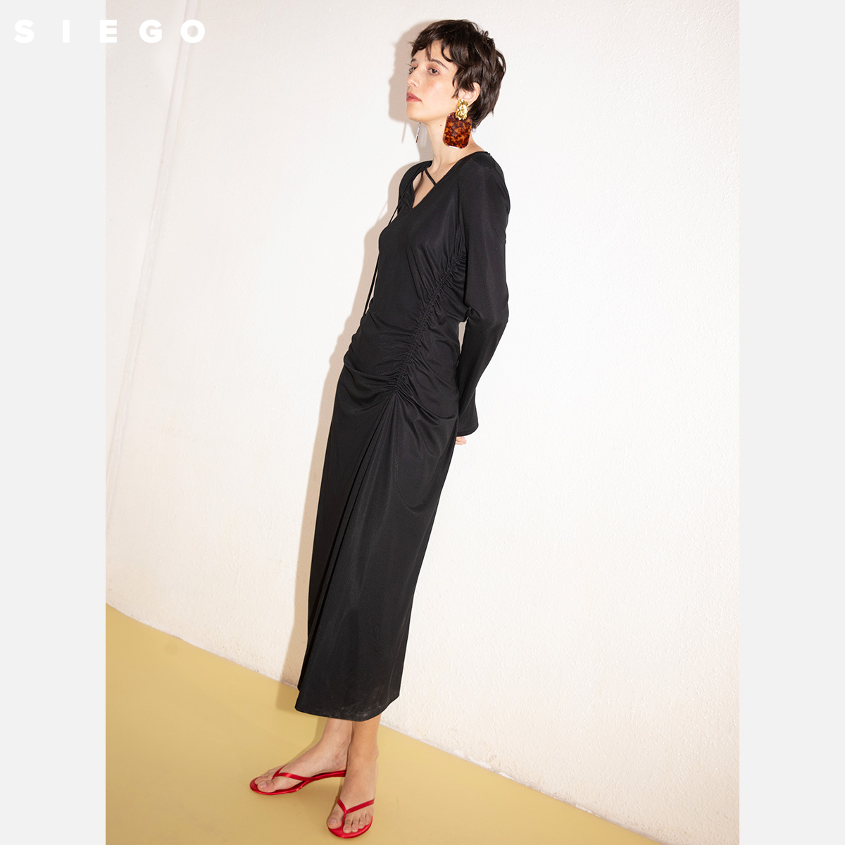 COCOBELLA简约气质黑色收腰极简风连衣裙短袖 长裙FR3033