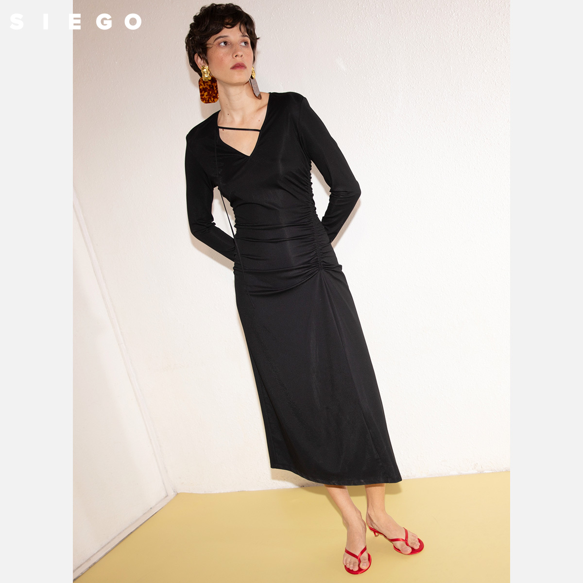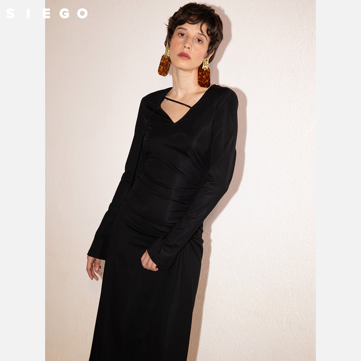 OCHIRLY欧时力 水溶棉V领针织连衣裙收腰A字软糯肌理感秋冬尖货