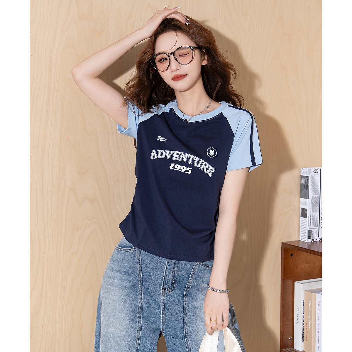 撞色上衣 T恤学生运动风休闲今年流行插肩袖 唐狮2025夏女新款 短袖