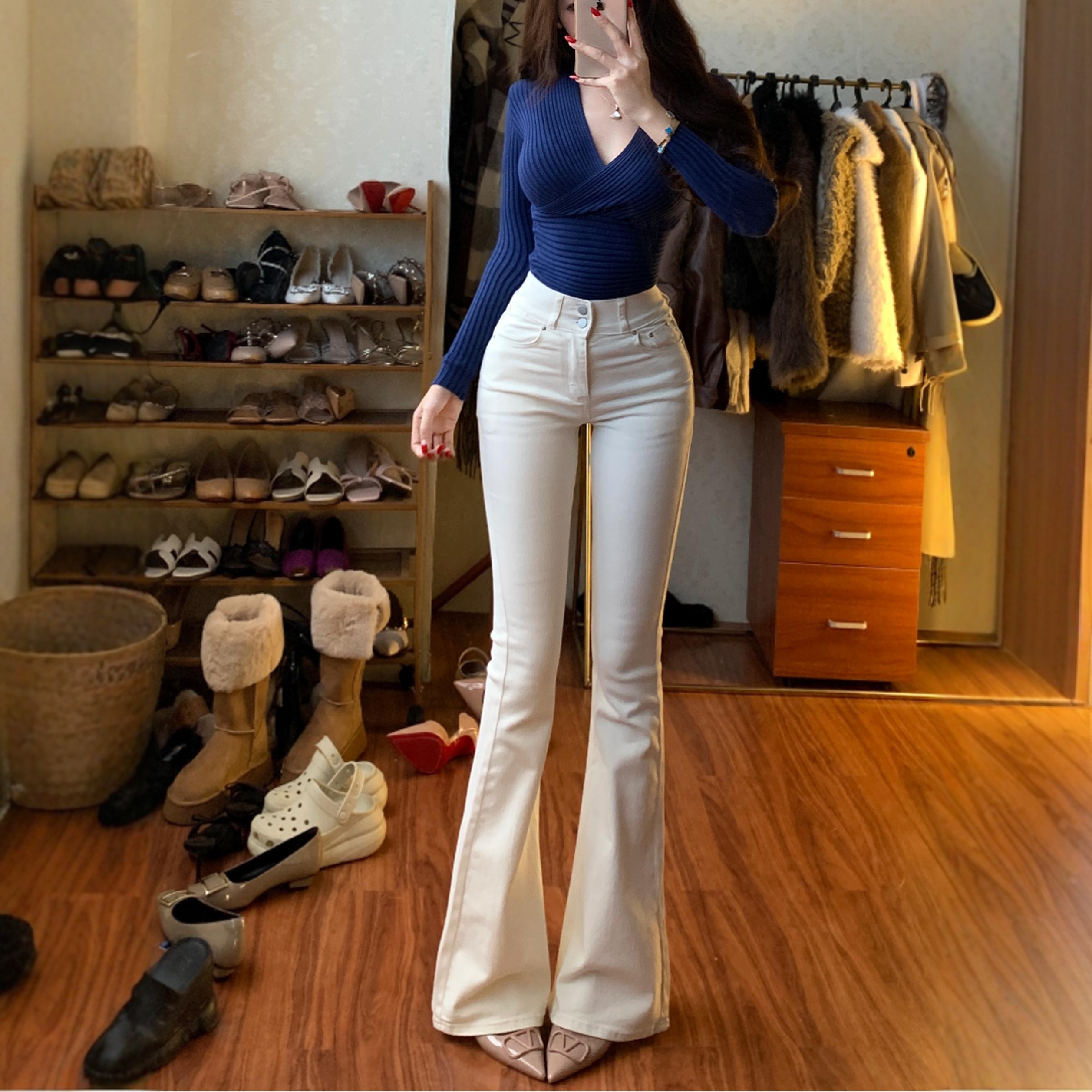小个子拖地直筒弹力怀旧喇叭裤 高腰马蹄浅色长裤 牛仔女美式 微喇裤