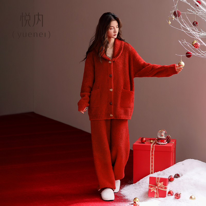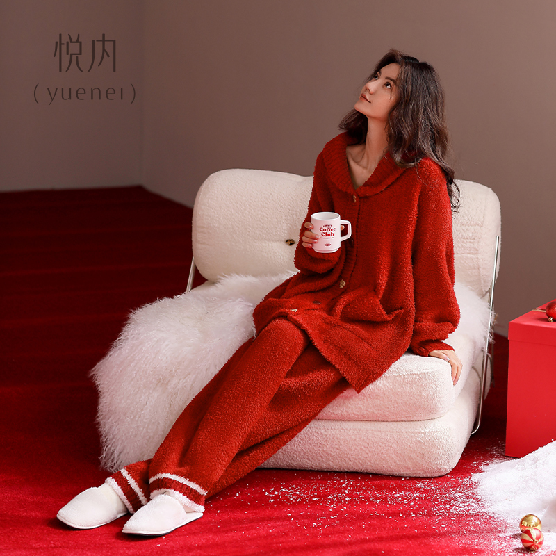 悦内半边绒睡衣女秋冬款 珊瑚绒保暖家居服圣诞新年红色本命年 冬季