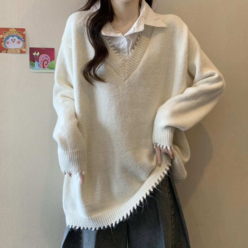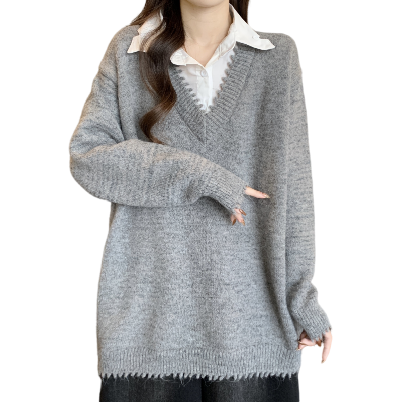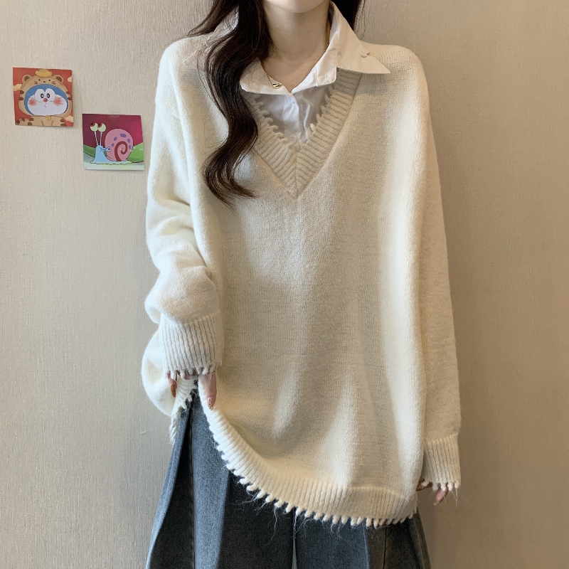 针织打底衫 胖mm宽松慵懒风中长款 上衣 领毛衣女秋冬大码 假两件衬衫