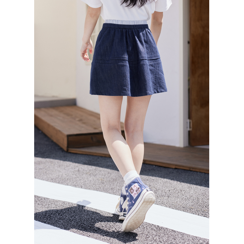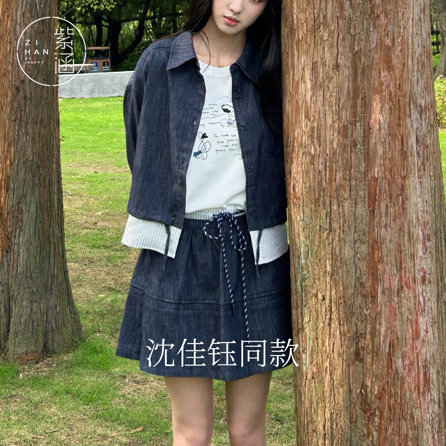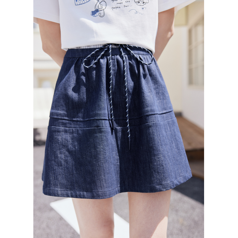 紫涵条纹拼接牛仔a字短裙女2025秋季 系绳松紧高腰藏青半身裙 新款